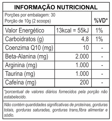 INGREDIENTES: Maltodextrina, Beta Alanina, Taurina, Arginina, Emulvit 8940 ( maltodextrina e cafeina), Coenzima Q10, aroma, ácido cítrico, dioxido de silicio , edulcorante sucralose .