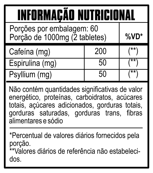 INGREDIENTES: Carbonato de cálcio, emulvit ( maltodextrina e cafeína ), maltodextrina, espirulina, psyllium, guaraná em pó, dióxido de silício, estearato de magnésio e revestimento cinza.