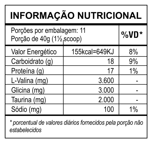Ingredientes: Whey Protein Concentrado, soro de leite, L-Valina, Glicina, Taurina, aroma, goma guar INS412, dióxido de silício, edulcorante sucralose.